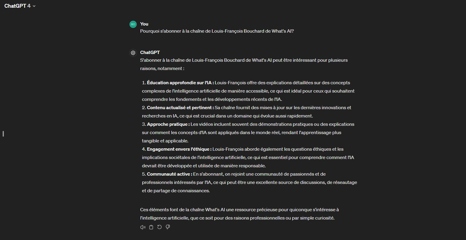 Si vous demandez pourquoi vous devriez vous abonner à la chaîne, il répondra en fonction de ce qui a le plus de sens d'après ses données d'entraînement, ici internet, qui dans ce cas semble être en donnant une liste de raisons pour s'abonner.