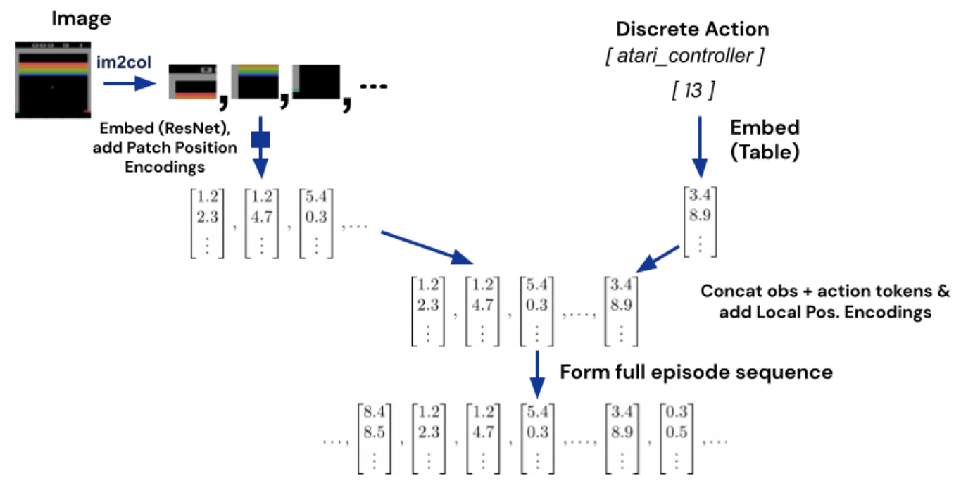 Pour les images, ils suivent la technique de patch utilisé dans ViT à l'aide d'un bloc ResNet largement utilisé, comme nous l'avons vu dans des articles précédents. Nous symbolisons également les pressions sur les boutons sous forme de nombres entiers pour les jeux Atari ou de valeurs discrètes.