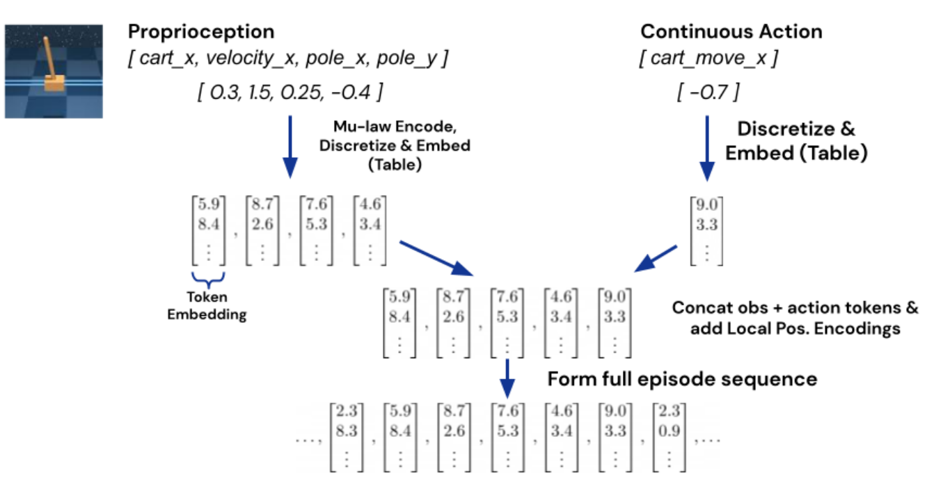 Proprioception et processus de tokenisation de l'action continue. Image tirée de l'article de Deepmind.